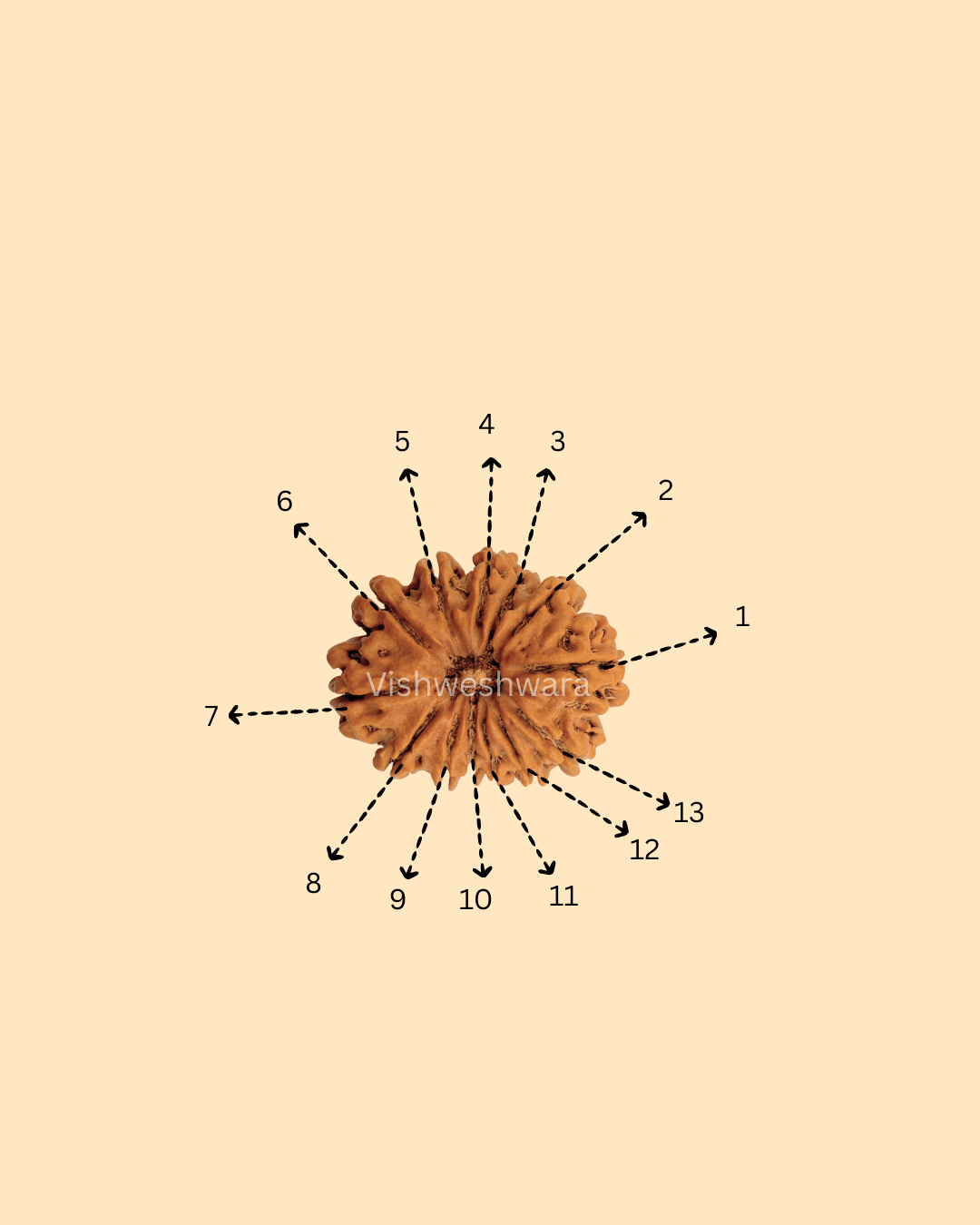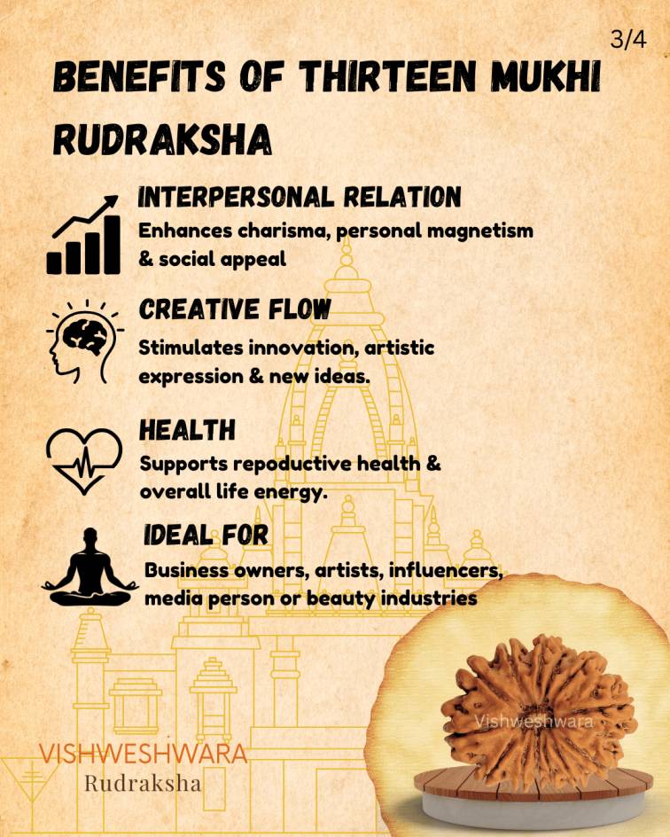 The 13 Mukhi Rudraksha symbolizes Lord Kamadeva, the Hindu god of love, attraction, and desire. This rare and highly powerful Rudraksha from Nepal is believed to unlock charm, magnetism, and charisma in the wearer, enhancing personal and professional relationships. It also aids in fulfilling deep desires both spiritual and material.Size: 28.14 mm, Weight: 4.25g.