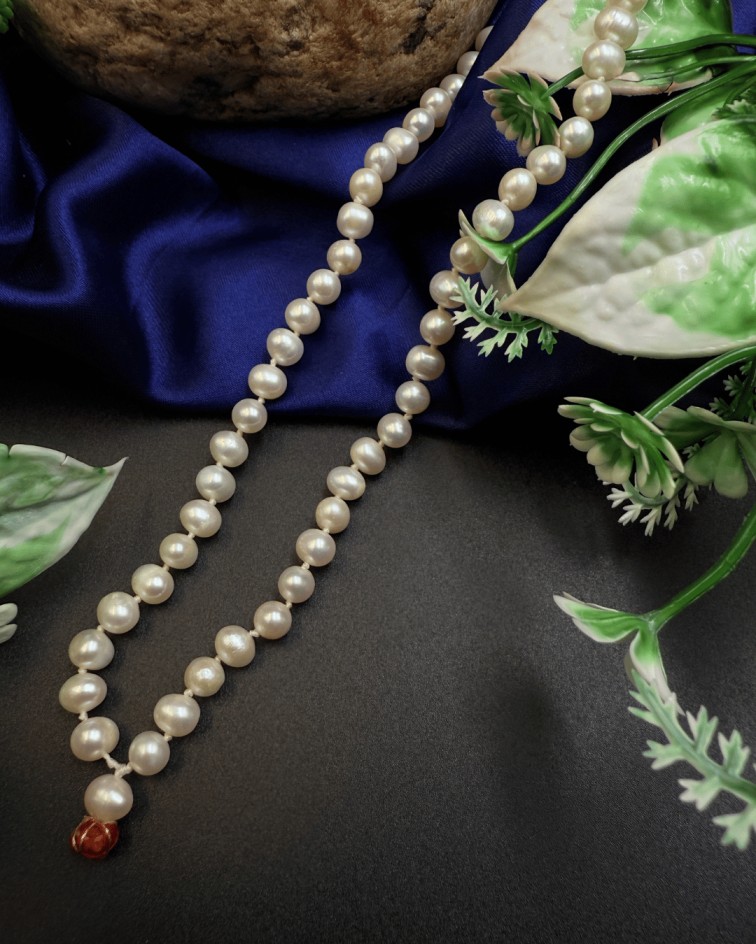 Embody grace and tranquility with this exquisite Pearl Mala, made from natural, lustrous pearls that radiate purity and calming energy. Revered in spiritual and Vedic traditions, pearls are symbols of inner peace, emotional strength, and divine femininity.