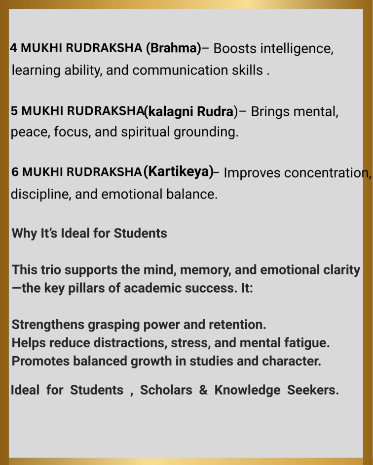 • 4 Mukhi (Brahma) – Boosts intelligence, learning ability, and communication skills